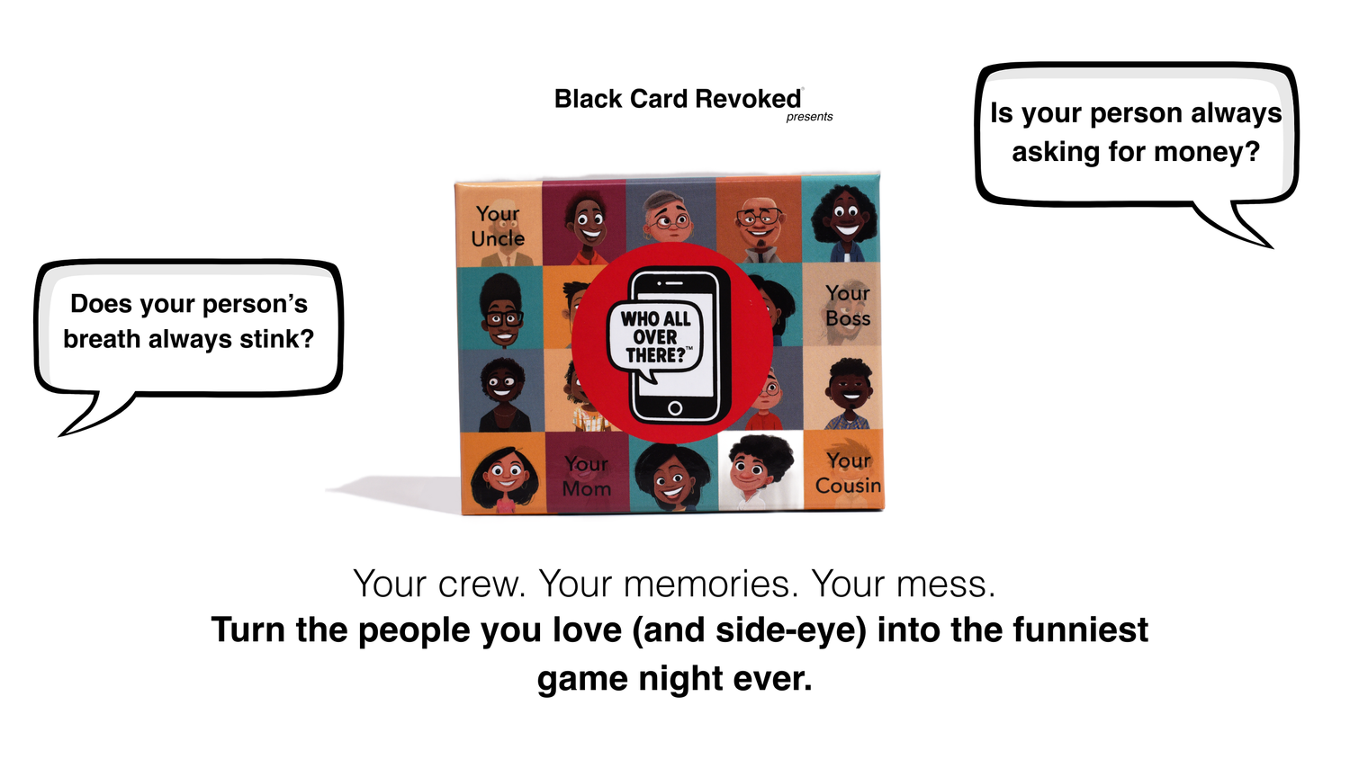 A hilarious twist on the classic guessing game! Instead of strangers or cartoon characters, "Who All Over There?" features the people you actually know—your friends, family, and maybe even that cousin who always shows up late.