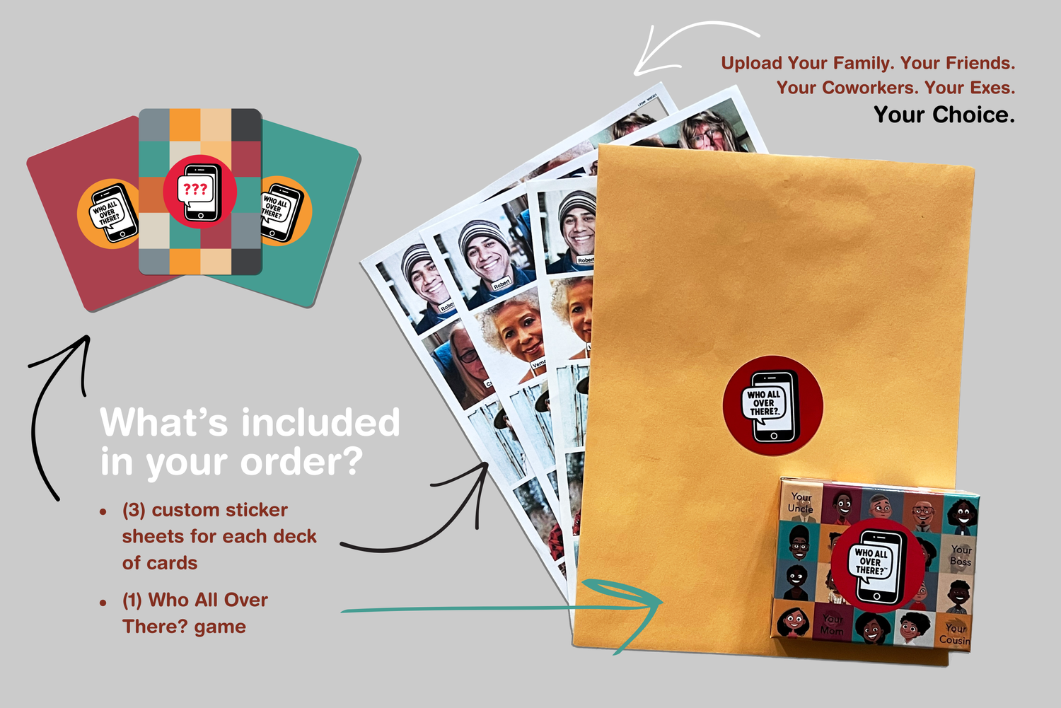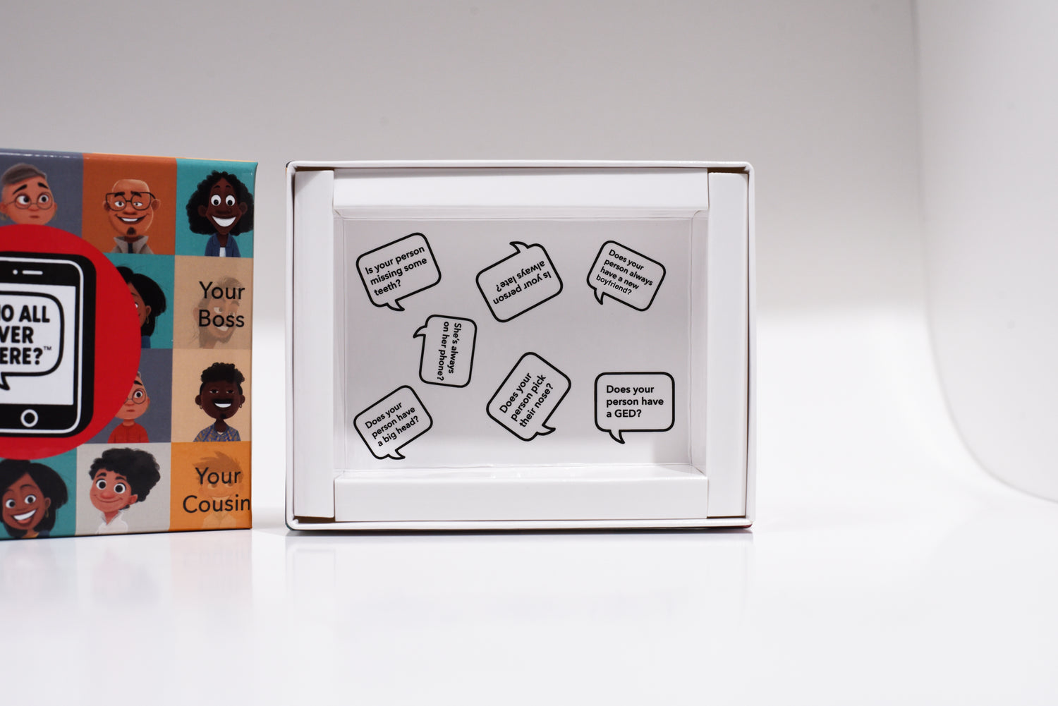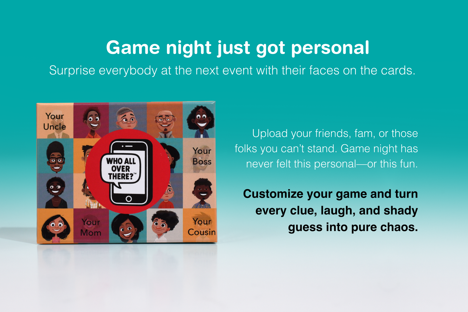 A hilarious twist on the classic guessing game! Instead of strangers or cartoon characters, "Who All Over There?" features the people you actually know—your friends, family, and maybe even that cousin who always shows up late.